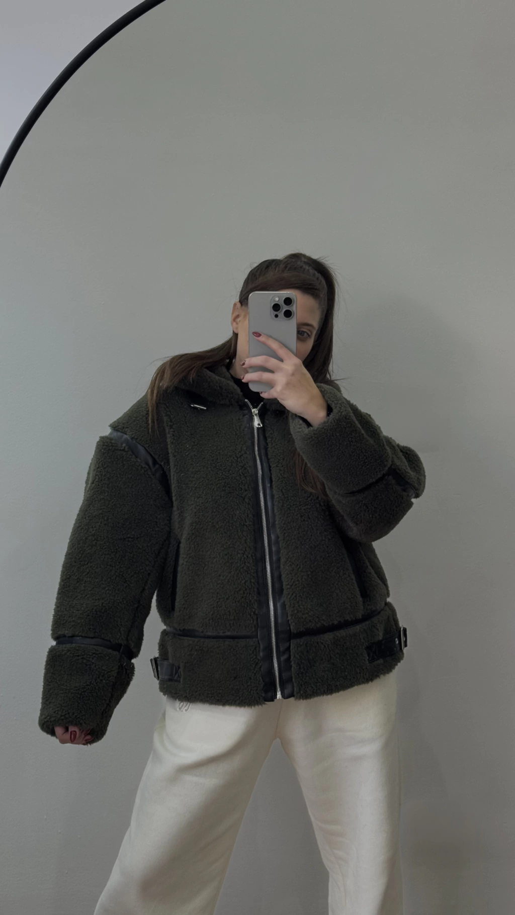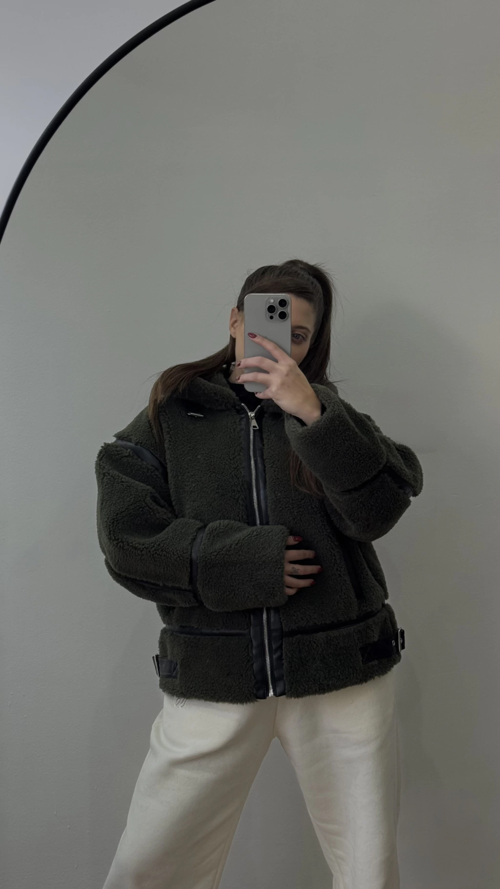 Este tapado estilo teddy combinado con cuero sintético negro redefine el abrigo invernal: cálido, envolvente y con mucha presencia visual.